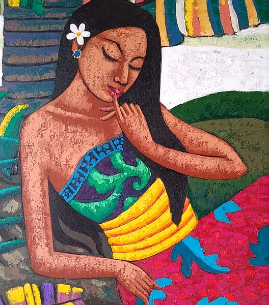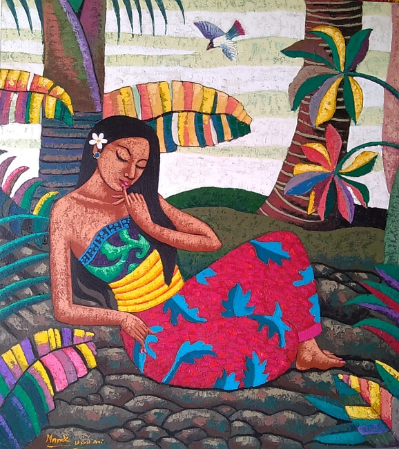 1975年ウブド郊外のクデワタン・ラシアカン村の農家に生まれる。少年時代は主にヤング・アーティスト スタイル画を学び、美術高校卒業後は独自の画風の創作を目指し、人物の目を伏せることにより、内面の感情を表現する画風を創作する。バリ島のホテルやギャラリーでの個展の実績あり。 |