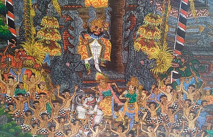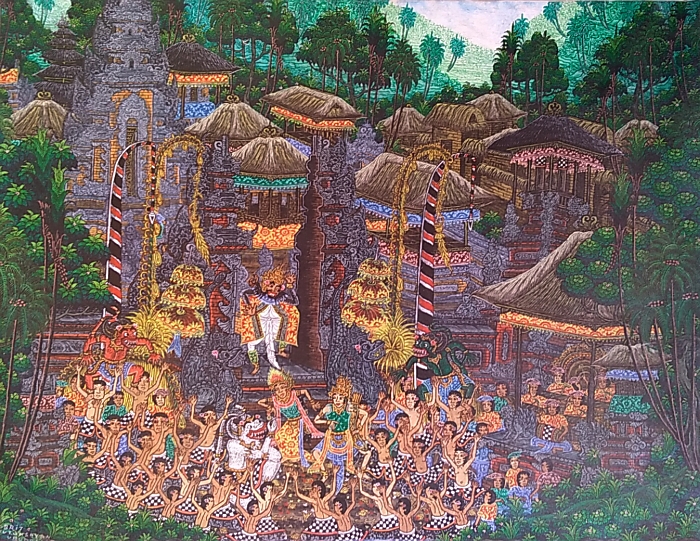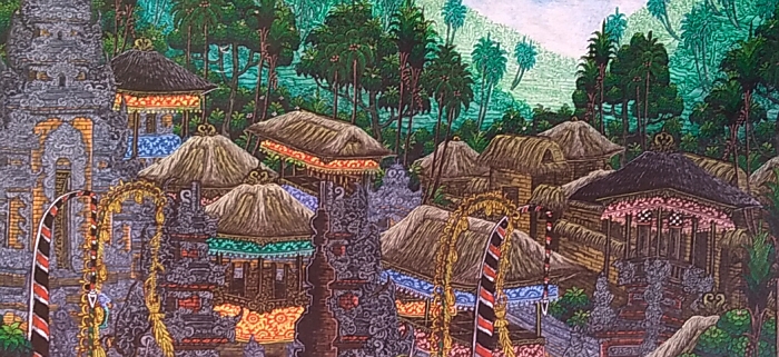 「ヤング・アーティスト」と呼ばれる細密画スタイルは、1950年代に興ったオランダ人画家アリー・シュミットを師とする青年アーティストたちの画法です。バリ島の農村生活や自然風景が、画面全体に隙間なく描かれ、溢れる光と鮮やかな色彩で陰影をつけずに描かれるのが特徴です。