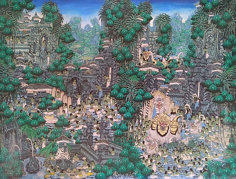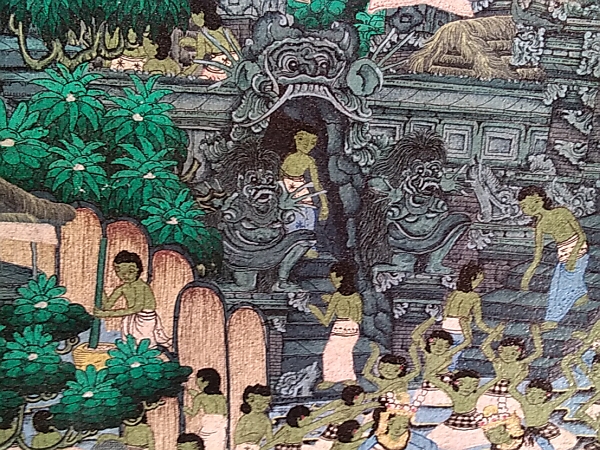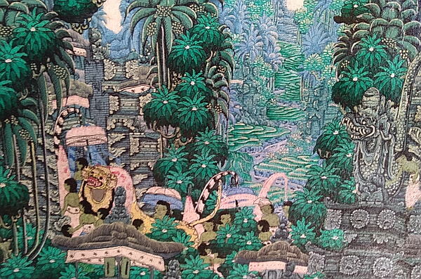 「ヤング・アーティスト」と呼ばれる細密画スタイルは、1950年代に興ったオランダ人画家アリー・シュミットを師とする青年アーティストたちの画法です。バリ島の農村生活や自然風景が、画面全体に隙間なく描かれ、溢れる光と鮮やかな色彩で陰影をつけずに描かれるのが特徴です。