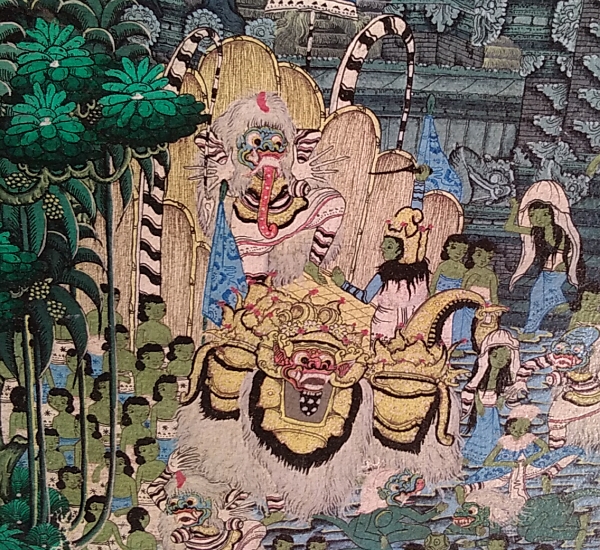年号の表記がないため正確な制作年は分かりませんが、鋭い描線と多彩でやわらなパステル調の色使い、見事な色調のコントラストなどから推察して、90年代に製作されたものと思われます。近年バリ島の絵画マーケットに出回っている粗雑なヤング・アーティスト画の作品群とは別次元の作品であることがお分かりになると思います。