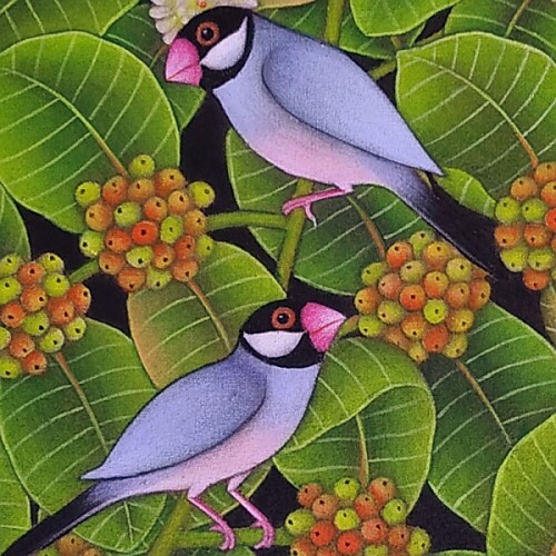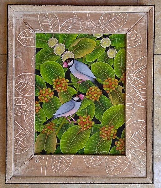 Martin氏の作品には文鳥をテーマにした作品が多く、クリッとした黒い大きな瞳の文鳥がとっても可愛いですね!絵の植物と一体の模様が彫られた、素朴な木製額縁がとても良く似合っています。