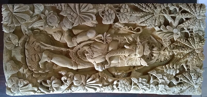 無垢のコクラン材に掘り出したばかりで、表面にまだワックスを塗っていない段階の作品です。この後、透明のワックスを塗り艶を出して仕上げます。
