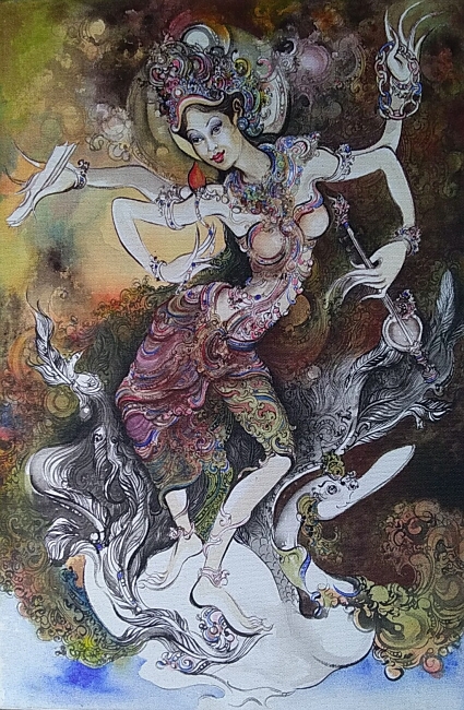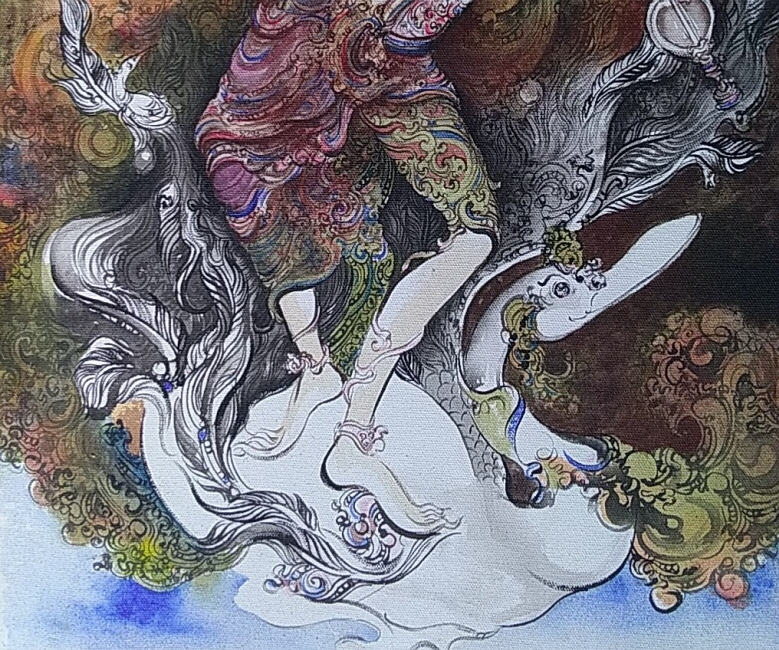 真っ白なキャンバス/紙に、流れるような筆使いで美しい花や女たちが一気にしかも繊細な描写で描きだされていく光景にはとても驚かされました。氏にとってアートとは脳内に浮かび上がった(創造した)イメージをキャンバスに映し出すことであり、それが一つの作品となって完成したものがアート作品とのこと。記憶の中から引っ張り出してきて描かれたものは、自分にとってはコピーのようなものと言っておられました。泉のように湧き出てくるインスピレーションを、産みの苦しみの中でイメージとして創造する姿は時に苦悩に満ちていました。鋭い眼光のKetut氏はその後さっさと釣りに出かけました。何故かバリ島では魚釣りが好きな画家さんと出会うことが多いようです。
