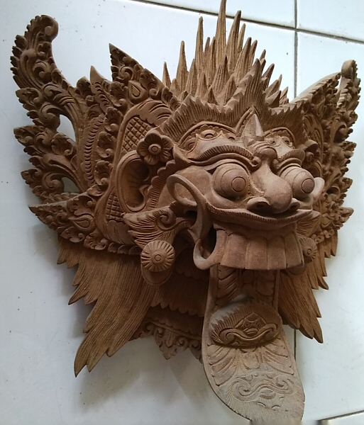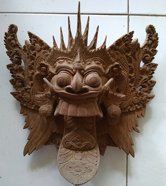 バリ島の奉納劇チャロナランに登場する魔女ランダは聖獣バロンと共に村祭りには欠かせない神様で、村々の神社に奉納されています。無垢のアカシア材に掘り出したばかりで、表面にまだワックスを塗っていない段階の作品です。この後、透明のワックスを塗り艶を出して仕上げます。壁掛装飾品としてお楽しみいただけます。