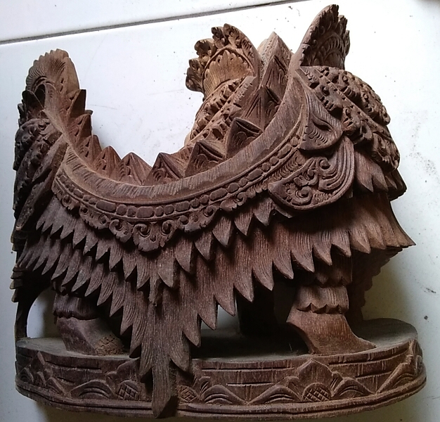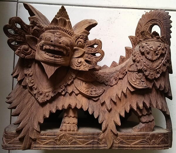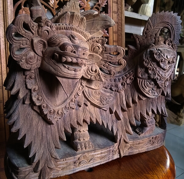 バリ島の奉納劇チャロナランに登場する聖獣バロンは魔女ランダと共に村祭りには欠かせない神様で、村々の神社に奉納されています。重厚な無垢のローズウッド(紫檀)に掘り出したばかりで、表面にまだワックスを塗っていない段階の作品です。この後、透明のワックスを塗り艶を出して仕上げます。