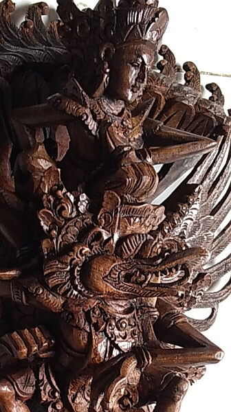 怪鳥ガルーダは創造の神ウイシュヌ神のしもべとなり、ウイシュヌ神が移動する時はガルーダに乗って飛ぶとされています。