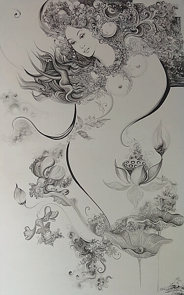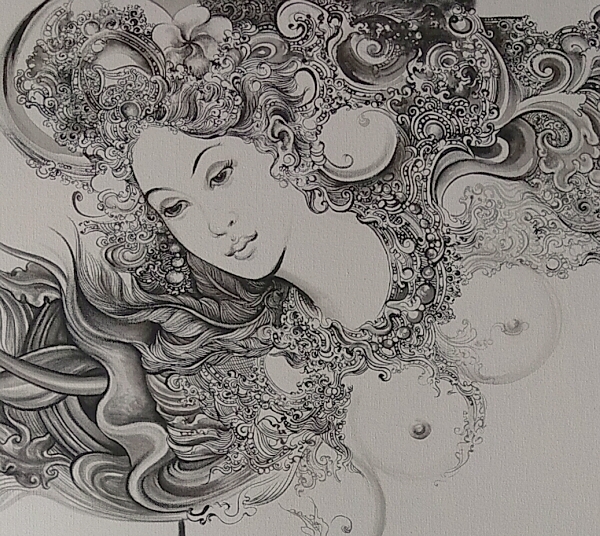 真っ白なキャンバス/紙に、流れるような筆使いで美しい花や女たちが一気にしかも繊細な描写で描きだされていく光景にはとても驚かされました。氏にとってアートとは脳内に浮かび上がった(創造した)イメージをキャンバスに映し出すことであり、それが一つの作品となって完成したものがアート作品で、記憶の中から引っ張り出してきて描かれたものは、自分にとってはコピーのようなものとのこと。泉のように湧き出てくるインスピレーションを、産みの苦しみの中でイメージとして創造する姿は時に苦悩に満ちていました。鋭い眼光のKetut氏はその後さっさと釣りに出かけました。何故かバリ島では魚釣りが好きな画家さん多いようです。