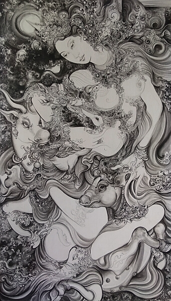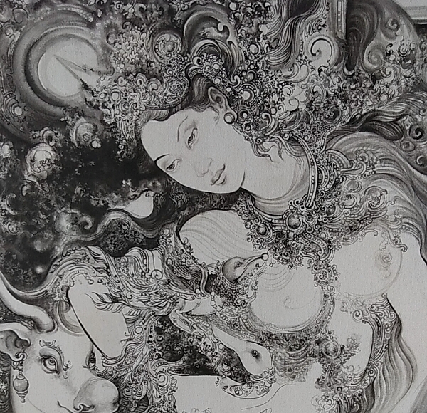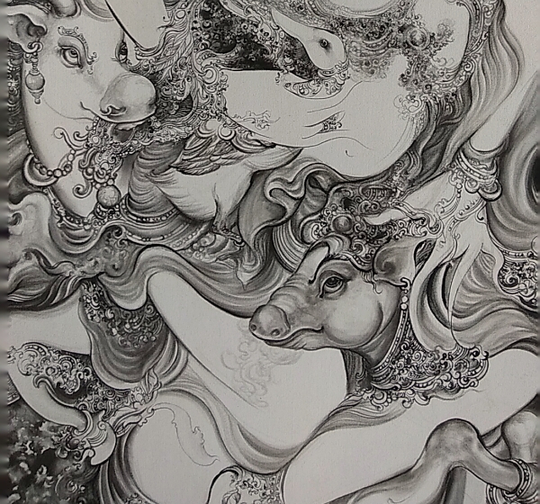 真っ白なキャンバス/紙に、流れるような筆使いで美しい花や女たちが一気にしかも繊細な描写で描きだされていく光景にはとても驚かされました。氏にとってアートとは脳内に浮かび上がった(創造した)イメージをキャンバスに映し出すことであり、それが一つの作品となって完成したものがアート作品で、記憶の中から引っ張り出してきて描かれたものは、自分にとってはコピーのようなものとのこと。泉のように湧き出てくるインスピレーションを、産みの苦しみの中でイメージとして創造する姿は時に苦悩に満ちていました。鋭い眼光のKetut氏はその後さっさと釣りに出かけました。何故かバリ島では魚釣りが好きな画家さん多いようです。