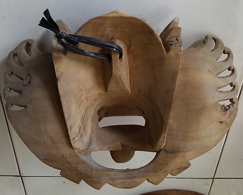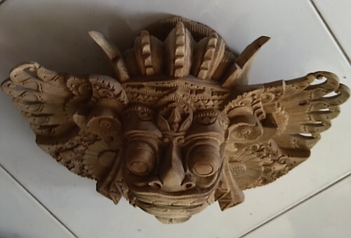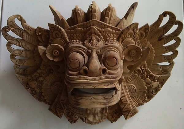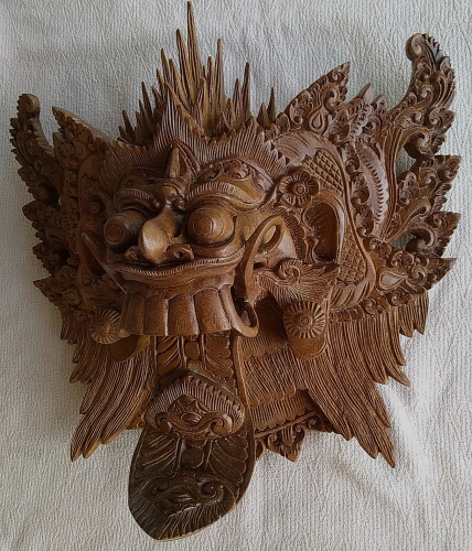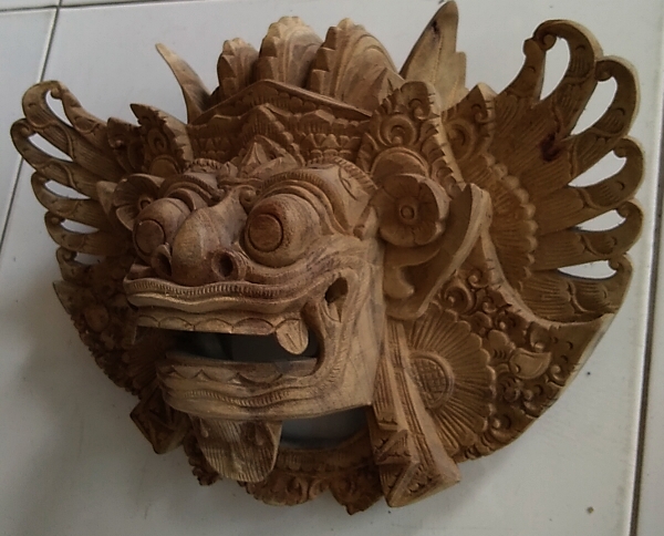 バリ島の奉納劇チャロナランに登場する聖獣バロンは魔女ランダと共に村祭りには欠かせない神様で、村々の神社に奉納されています。重厚な無垢のアカシア材に掘り出したばかりで、表面にまだワックスを塗っていない段階の作品です。この後、透明のワックスを塗り艶を出して仕上げます。