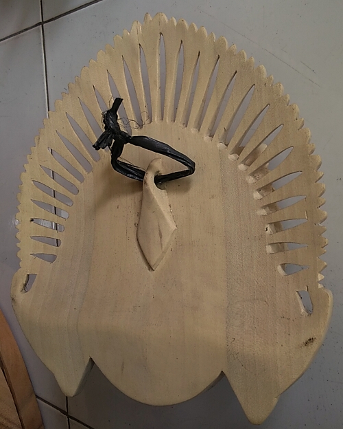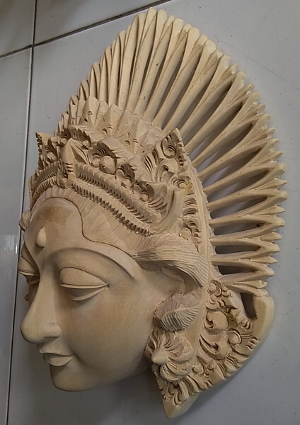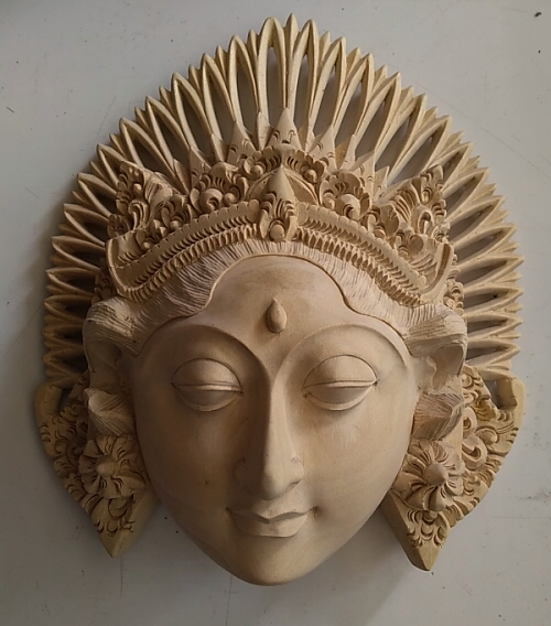 白い木肌の美しい無垢のクロコダイルウッドにに彫り込まれたレゴン・ダンサーのマスク作品です。布で丹念に磨かれたのでしょうか、繊細な彫りと光沢のある表面とが柔らかな表情を一層引き立たせています!半年に一度は油性ワックスで磨いて乾燥防止と埃を取り払ってください!