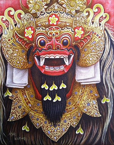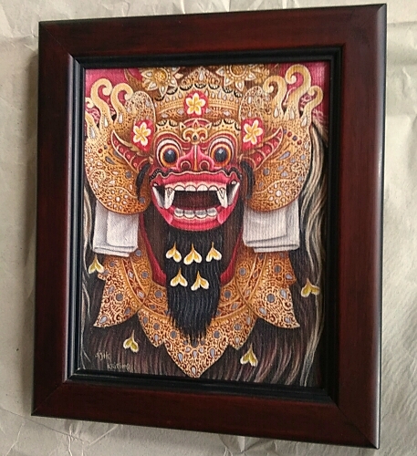 バリ島ウブドのモンキーフォレスト通りアトリエ件ギャラリーを構える地元プンゴセカン村の画家、Sudana氏所有の作品です。聖獣バロンはバリ・ヒンドウ経独自の象徴的な獣神で、何処の村にも聖体が安置され、魔女ランダと共に村の神社の祭礼には欠かせない存在です。