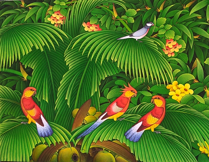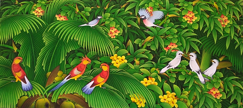 横長の大きな画面全体に描かれた野鳥と植物の枝葉一つ一つが丁寧に描かれていて、お部屋の外に熱帯の森が広がっているような気分にさせてくれる素敵な作品です!