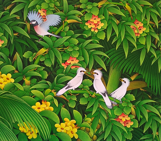 上から2羽の文鳥、左に3羽のコンゴウインコ、右の3羽の白い鳥はバリ島の固有種「バリ・スターリング(カンムリシロムク)」です。(熱帯野鳥図鑑を参照)背景には熱帯植物の2種のプルメリアと椰子の木、竹が隙間なく描き込まれています。