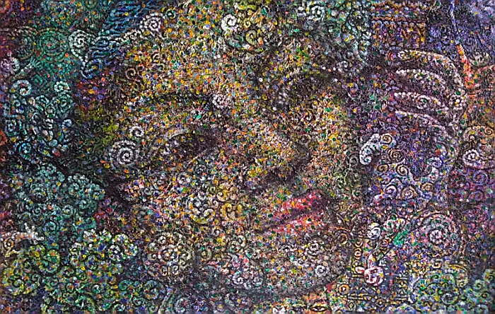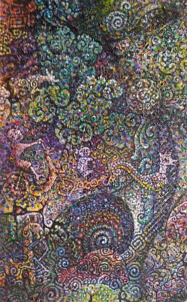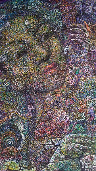 石板に刻まれたレリーフをイメージした作品で、楽器を奏でる若い踊り娘を中心に、その周りにバリ島の飾り模様(オーナメント)を纏った人や動物たちが、音色に誘われて集まってきた場面のようです。