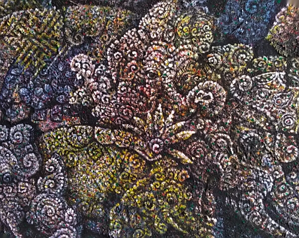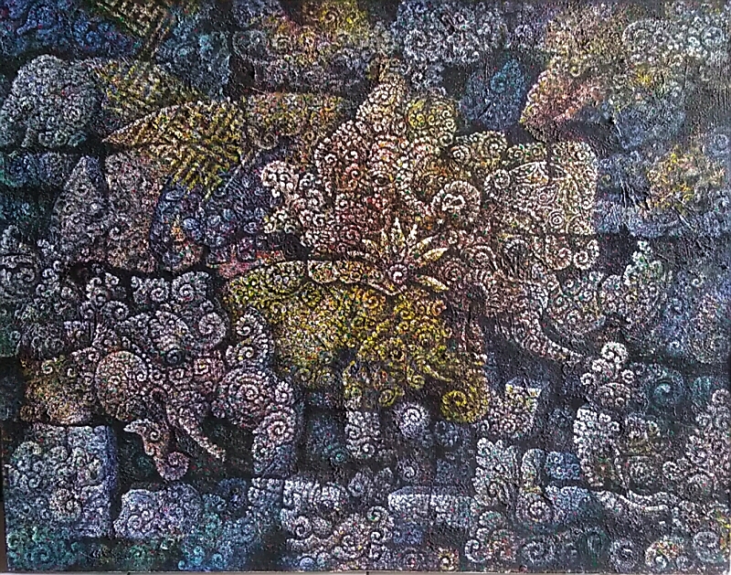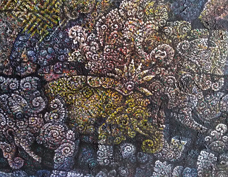 石板に刻まれたレリーフをイメージした作品で、モザイクを敷き詰めた騙し絵のような技法で画面のアチコチに象が描かれています。絵の中心に3頭の像が見えますが、その周りにも数頭の象の顔や姿形が見えますが全部で何頭いるのやら…。