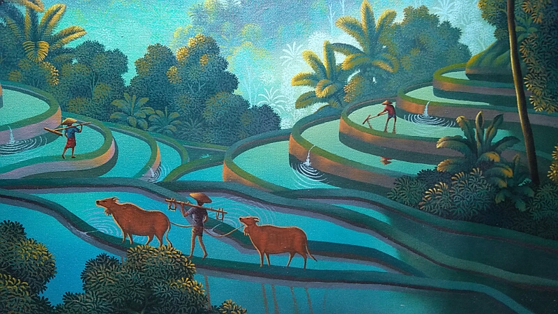 WARDITA氏と奥様SRINIさん共作の幻想的な田園風景画で、構図と仕上げをWARDITA氏が担当、配色と細かな着色をSRINIさんが担当して完成させた作品です。