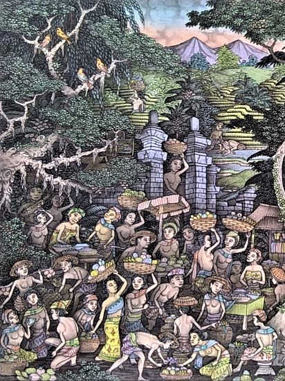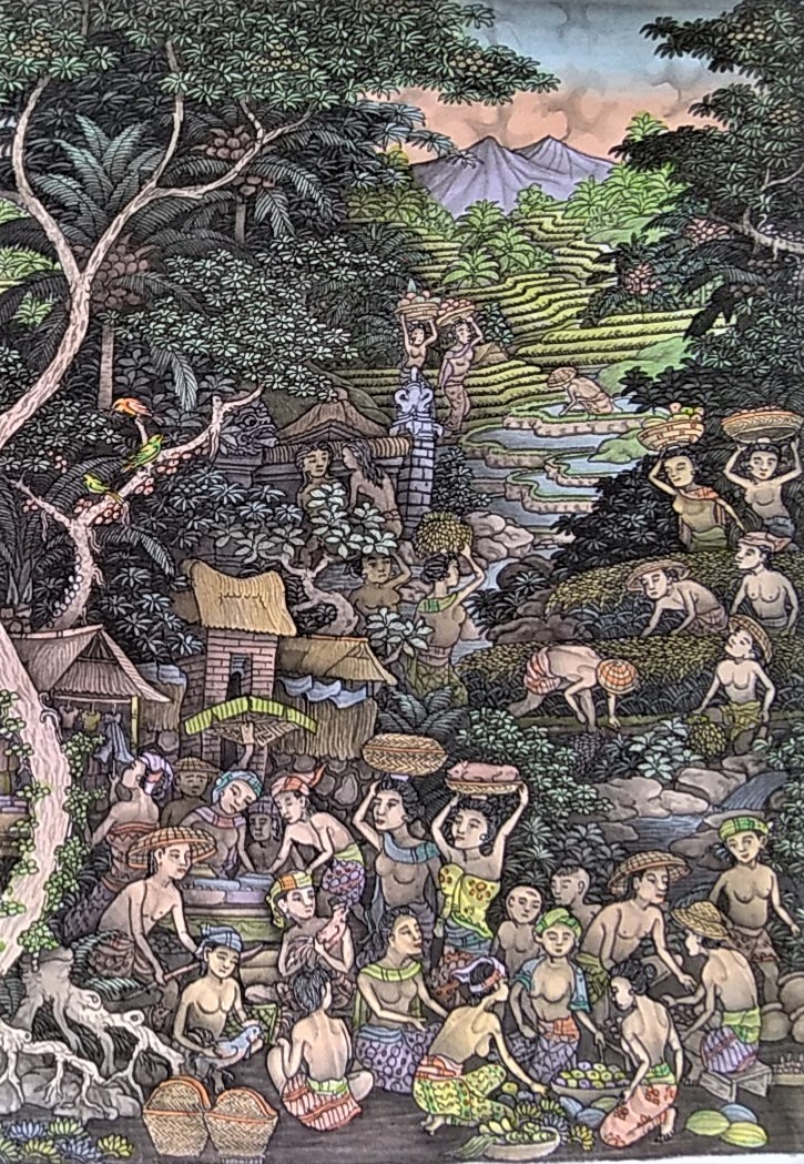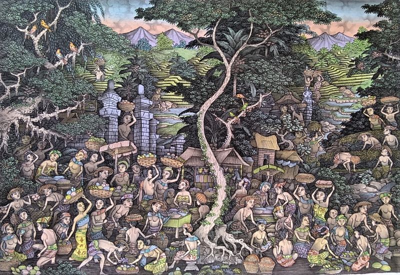 濁りのない美しい配色のグラデーションと、線の一つ一つが巧みな筆使いでくっきりと描写されています。村人たちの日々の生活や祭礼行事などが、美しいバリ島の農村風景を背景にコミカルなタッチで描かれた躍動的で楽しい作品です!ケチャ・ダンスはラーマヤナ物語を題材に創られた臨場感に溢れた迫力ある舞踊劇で、バリ島を訪れる旅行者に最も人気の高い野外劇として有名です。