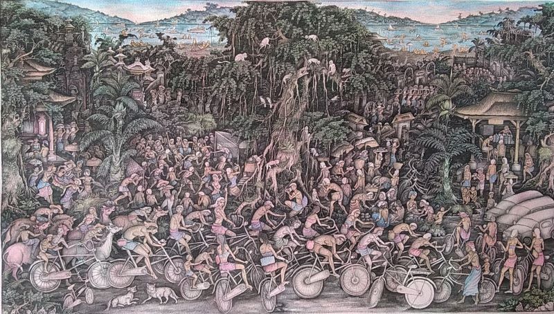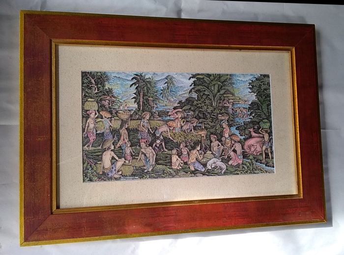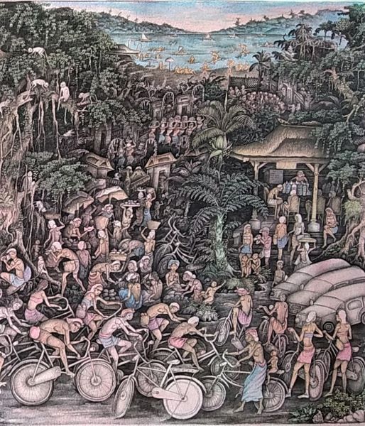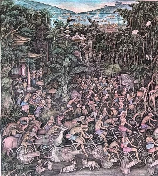 濁りのない美しい配色のグラデーションと、線の一つ一つが巧みな筆使いでくっきりと描写されています。村人たちの日々の生活や祭礼行事などが、美しいバリ島の農村風景を背景にコミカルなタッチで描かれた躍動的で楽しい作品です!ケチャ・ダンスはラーマヤナ物語を題材に創られた臨場感に溢れた迫力ある舞踊劇で、バリ島を訪れる旅行者に最も人気の高い野外劇として有名です。