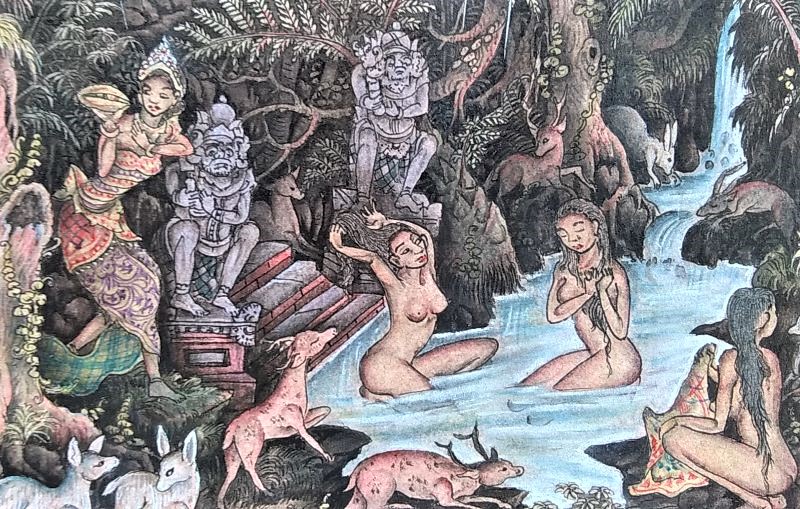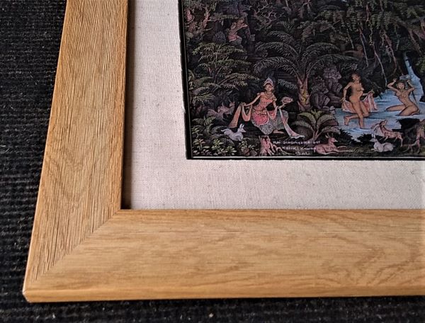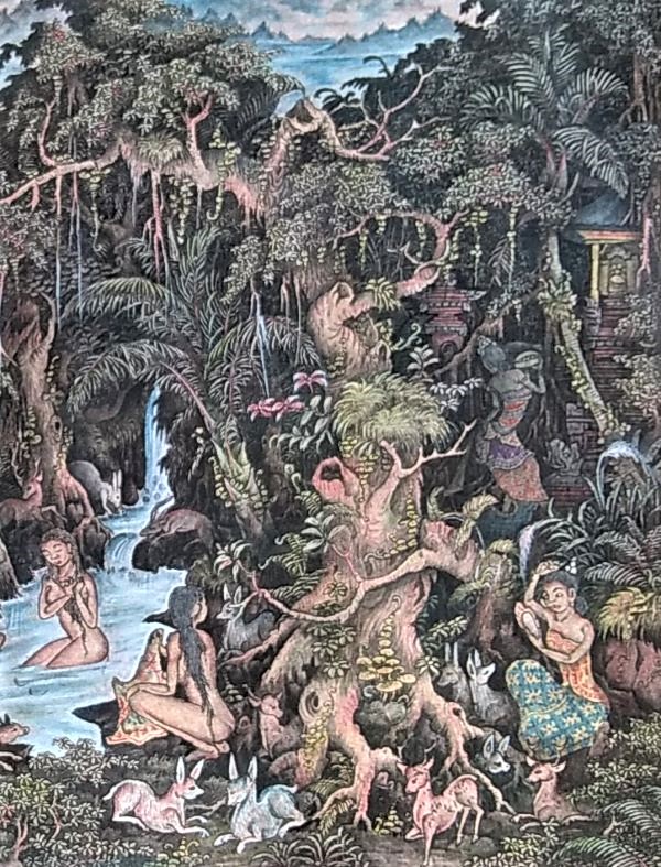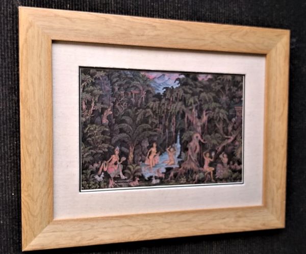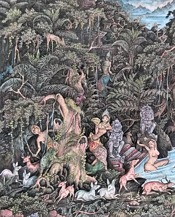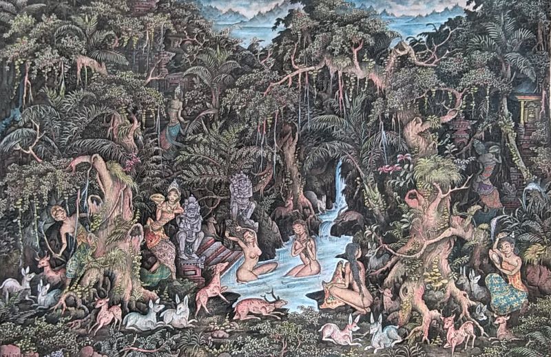 濁りのない美しい配色のグラデーションと、線の一つ一つが巧みな筆使いでくっきりと描写されています。村人たちの日々の生活や祭礼行事などが、美しいバリ島の農村風景を背景にコミカルなタッチで描かれた躍動的で楽しい作品です!