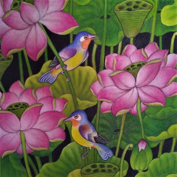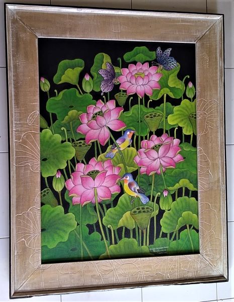 蓮池に優雅に咲くピンクの蓮の花とそれに群がる蝶と野鳥のつがいが描かれた作品です。