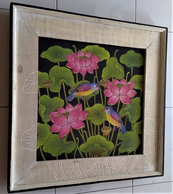 蓮池に優雅に咲くピンクの蓮の花とそれに群がる野鳥のつがいが描かれた作品です。
