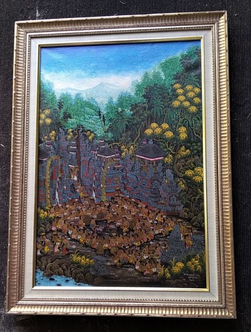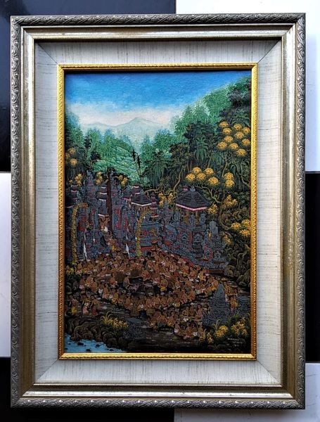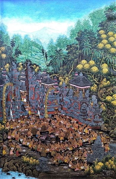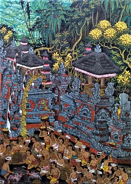 バリ島の美しい田園風景の中に、古代遺跡を思わせる荘厳な寺院が建ち、村人たちが奉納の闘鶏に興じている場面のようです。