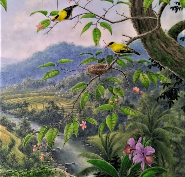透明で遠近感に溢れた画風で、熱帯雨林に囲まれた火山島バリ島の雄大な自然が窓の外に広がるように描かれています。画面の左側の白い野鳥はカンムリシロムク(バリスターリング)で右側には文鳥が描かれいます。どちらもバリ島の自然に生息する野鳥ですよ!