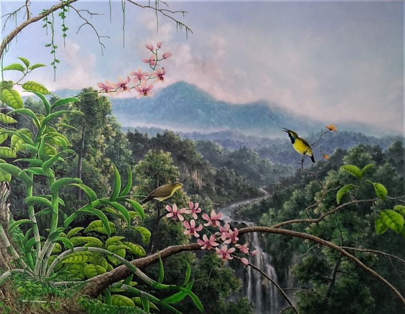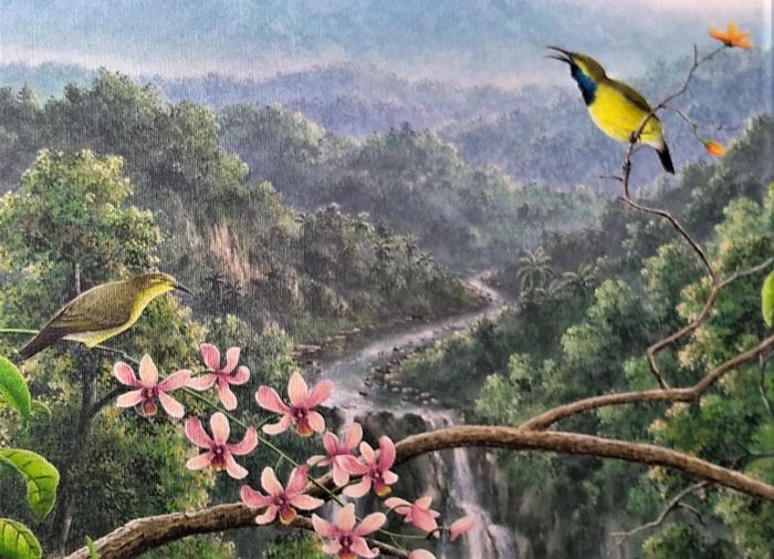 1963年 バリ島Ubud生まれ。アクリル画が専門で芸術大学で教鞭を執るかたわら後輩画家の指導に力を入れている。熱帯雨林に囲まれた火山島バリ島の雄大な自然が窓の外に広がるように描かれ、可憐な野鳥の姿が画面をきりりと引き締めています。透明で遠近感に溢れた画風はトンネル画法とも呼ばれる。 |