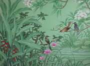 蓮池と野鳥・緑の背景 |