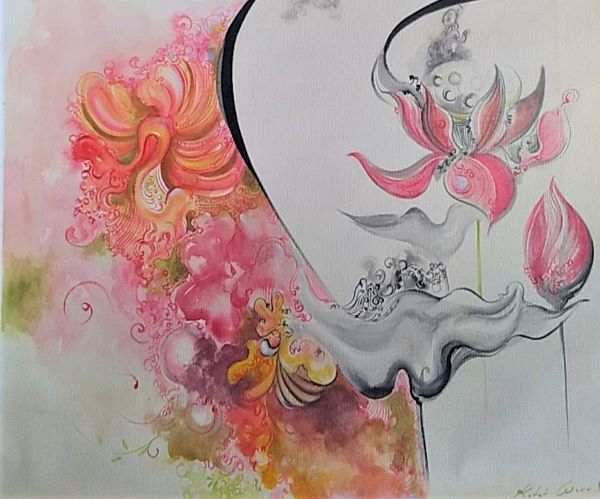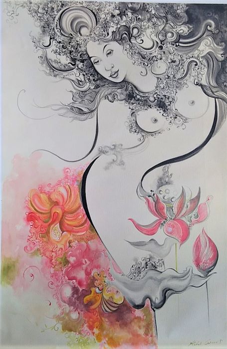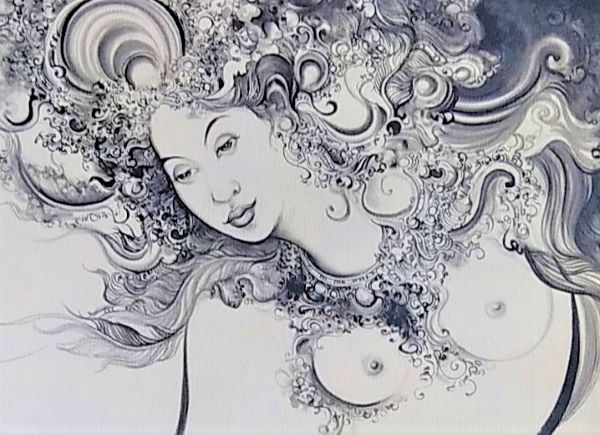 真っ白なキャンバス/紙に、流れるような筆使いで美しい花や女たちが一気にしかも繊細な描写で描きだされていく光景にはとても驚かされました。氏にとってアートとは脳内に浮かび上がった(創造した)イメージをキャンバスに映し出すことであり、それが一つの作品となって完成したものがアート作品で、記憶の中から引っ張り出してきて描かれたものは、自分にとってはコピーのようなものとのこと。泉のように湧き出てくるインスピレーションを、産みの苦しみの中でイメージとして創造する姿は時に苦悩に満ちていました。鋭い眼光のKetut氏はその後さっさと釣りに出かけました。何故かバリ島では魚釣りが好きな画家さん多いようです。