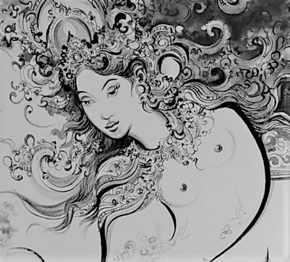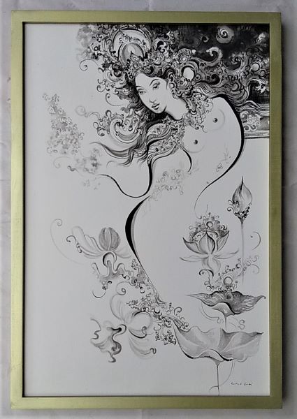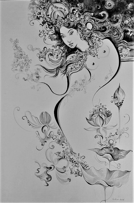 真っ白なキャンバス/紙に、流れるような筆使いで美しい花や女たちが