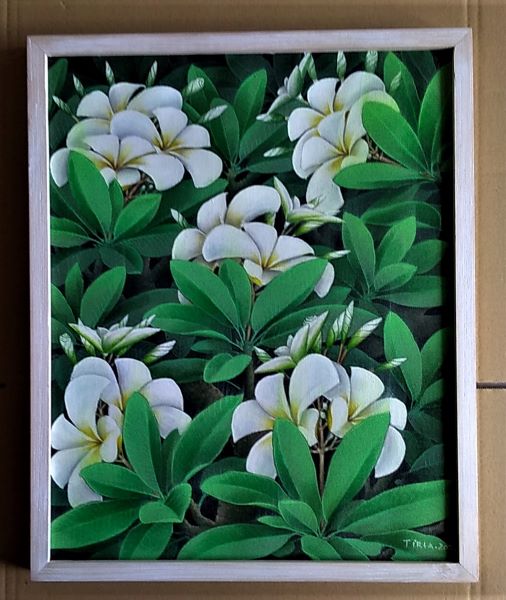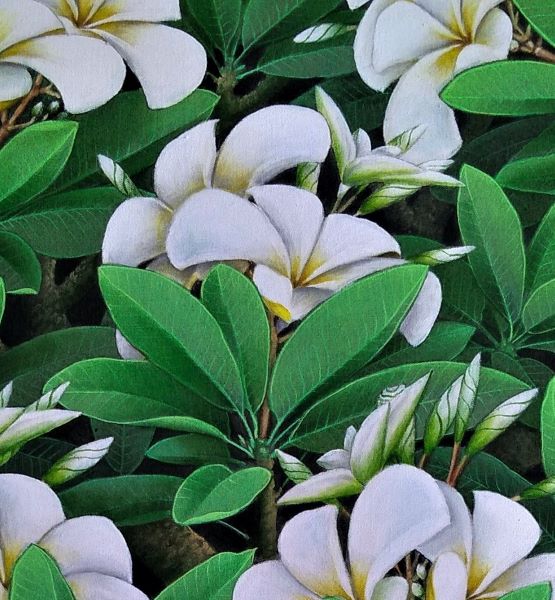 匂い立つほどに濃厚なプルメリアの花弁が咲き乱れていますね!葉の一枚一枚、花弁の一枚一枚が異なる色合いで、立体的に描かれた感動的な作品で、まるで、窓からプルメリア・ガーデンを覗いているような気分にさせてくれる作品です。