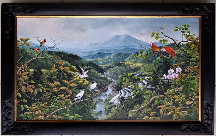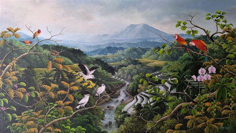 1963年 バリ島Ubud生まれ。アクリル画が専門で芸術大学で教鞭を執るかたわら後輩画家の指導に力を入れている。熱帯雨林に囲まれた火山島バリ島の雄大な自然が窓の外に広がるように描かれ、可憐な野鳥の姿が画面をきりりと引き締めています。透明で遠近感に溢れた画風はトンネル画法とも呼ばれる。 |