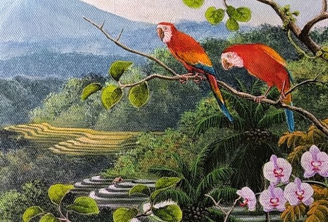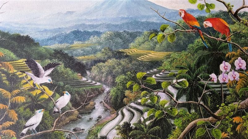 透明で遠近感に溢れた画風で、熱帯雨林に囲まれた火山島バリ島の雄大な自然が窓の外に広がるように描かれています。画面の左側の白い野鳥はカンムリシロムク(バリスターリング)で右側には文鳥が描かれいます。どちらもバリ島の自然に生息する野鳥ですよ!