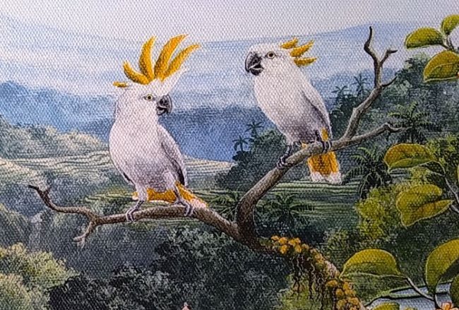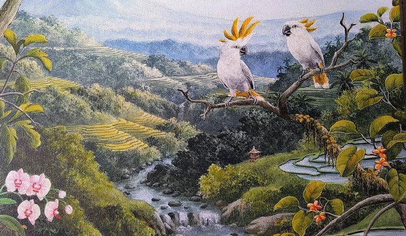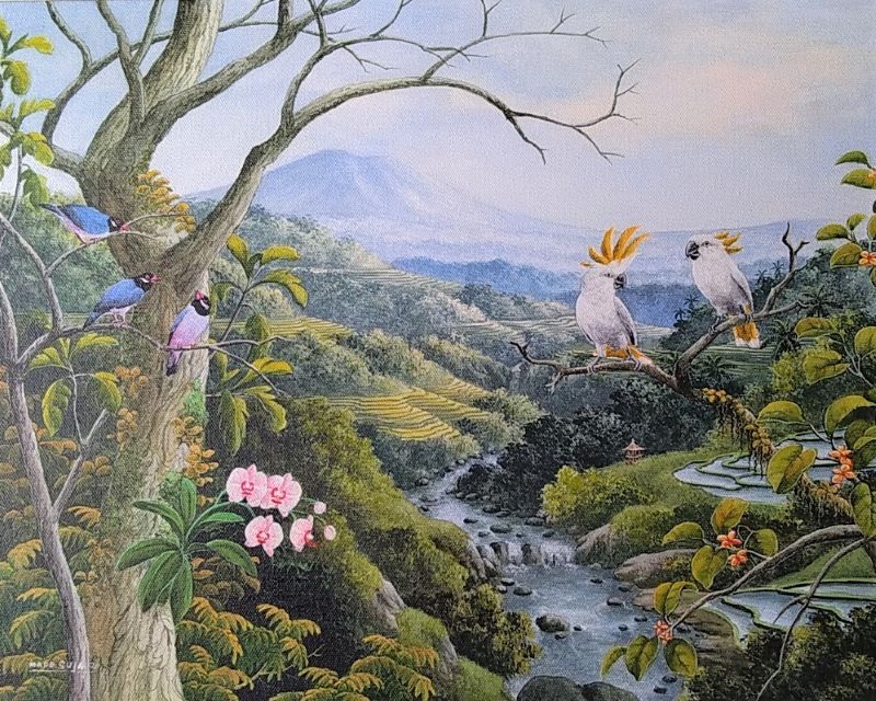 透明で遠近感に溢れた画風で、熱帯雨林に囲まれた火山島バリ島の雄大な自然が窓の外に広がるように描かれています。画面の左側の白い野鳥はカンムリシロムク(バリスターリング)で右側には文鳥が描かれいます。どちらもバリ島の自然に生息する野鳥ですよ!