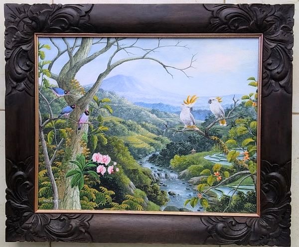 1963年 バリ島Ubud生まれ。アクリル画が専門で芸術大学で教鞭を執るかたわら後輩画家の指導に力を入れている。熱帯雨林に囲まれた火山島バリ島の雄大な自然が窓の外に広がるように描かれ、可憐な野鳥の姿が画面をきりりと引き締めています。透明で遠近感に溢れた画風はトンネル画法とも呼ばれる。 |