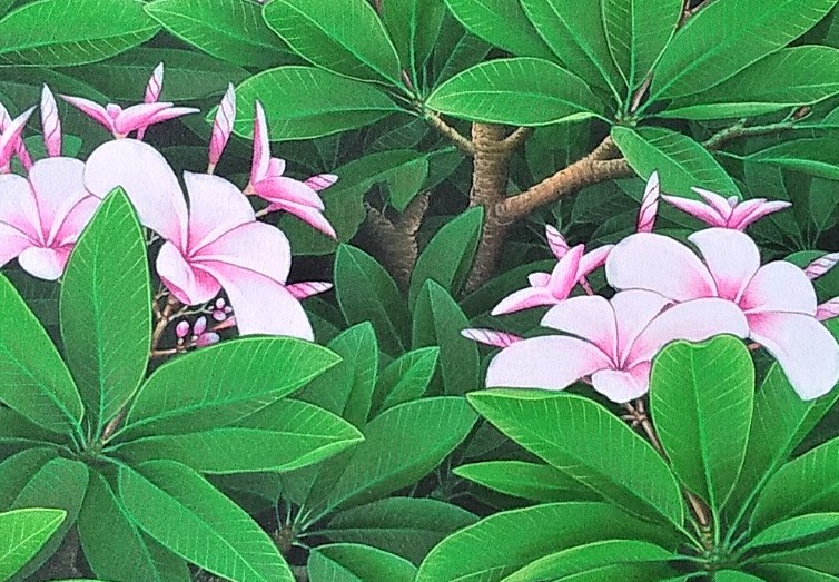 匂い立つほどに濃厚なプルメリアの花弁が咲き乱れていますね!葉の一枚一枚、花弁の一枚一枚が異なる色合いで、立体的に描かれた感動的な作品で、まるで、窓からプルメリア・ガーデンを覗いているような気分にさせてくれる作品です。