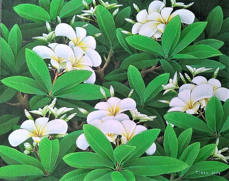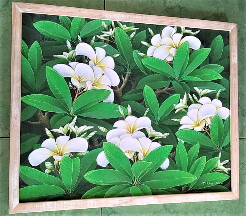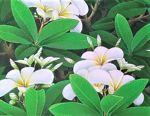 匂い立つほどに濃厚なプルメリアの花弁が咲き乱れていますね!葉の一枚一枚、花弁の一枚一枚が異なる色合いで、立体的に描かれた感動的な作品で、まるで、窓からプルメリア・ガーデンを覗いているような気分にさせてくれる作品です。