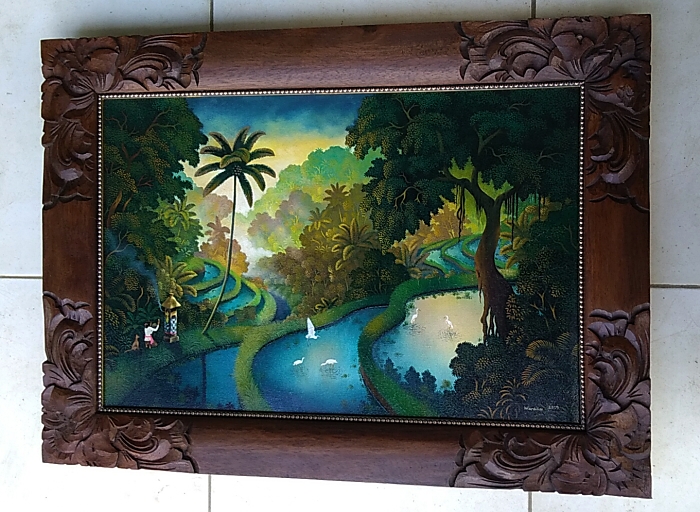 この作品はバリ島の香りいっぱいの重厚な木彫額縁に入れてお届けいたします。