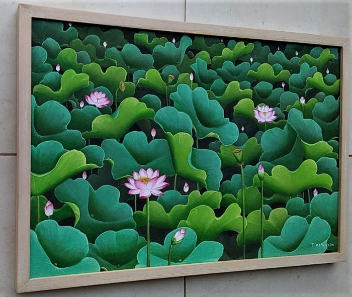 この作品は輝くような緑の蓮池を優しく包んだホワイトウォッシュの木製ボックスタイプ額縁に入れてお届けいたします。