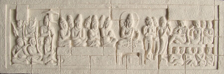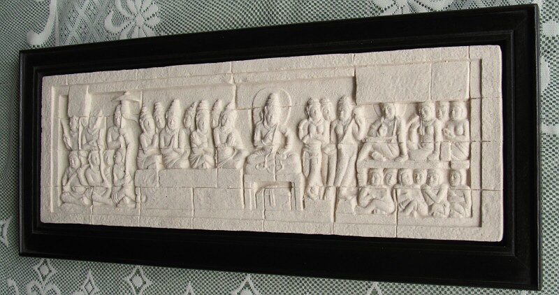 仏教遺跡ボロブドールの回廊に刻まれた壁画を縮小した複製です。暗めの場所に飾って、柔らかなライトアップでお楽しみください。