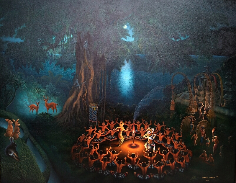 当時からバリ観光の魅力は祭りや芸能であり、バリヒンドゥー教の宗教的生活がその背景にあります。日々どこかの村でオダランという寺の祭礼が行われ、儀礼に伝統的音楽の演奏と舞踊や芸能が奉納されます。宗教がバリ人の生活と深く結びついていることが、バリ絵画にも表れていることを強く感じています。
