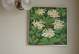 写真上:左からテギ作品「熱帯花鳥画」とグストラ作品「熱帯幻想絵画」、写真右ティルタ作品「カーネーションの花束」。
