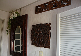 昼間は逆光になり真っ暗になるので陽が沈んだ5時過ぎに撮りました。全体を撮りたかったのですがカーテンに向けての写真はくらくなるので諦めました。日ごろから植木はインテリアに欠かせないものと思い、いろいろ並べた結果これが一番でした。長い間の夢が実現できて、こんなに嬉しいことはありません。主人の手前バリ島に毎年いくことに気を遣って「やっと思い通りに出来上がった!」と言ったら、長年頑張って生きて来たことへのご褒美というようなことを言われて嬉しかったです。(笑)