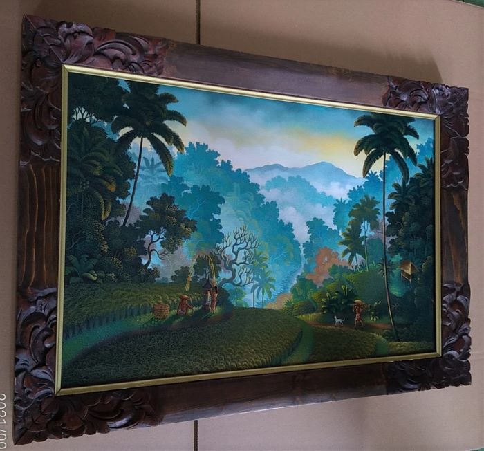 この作品はバリ島の香りいっぱいの重厚な木彫額縁に入れてお届けいたします。