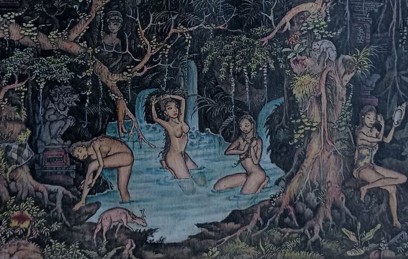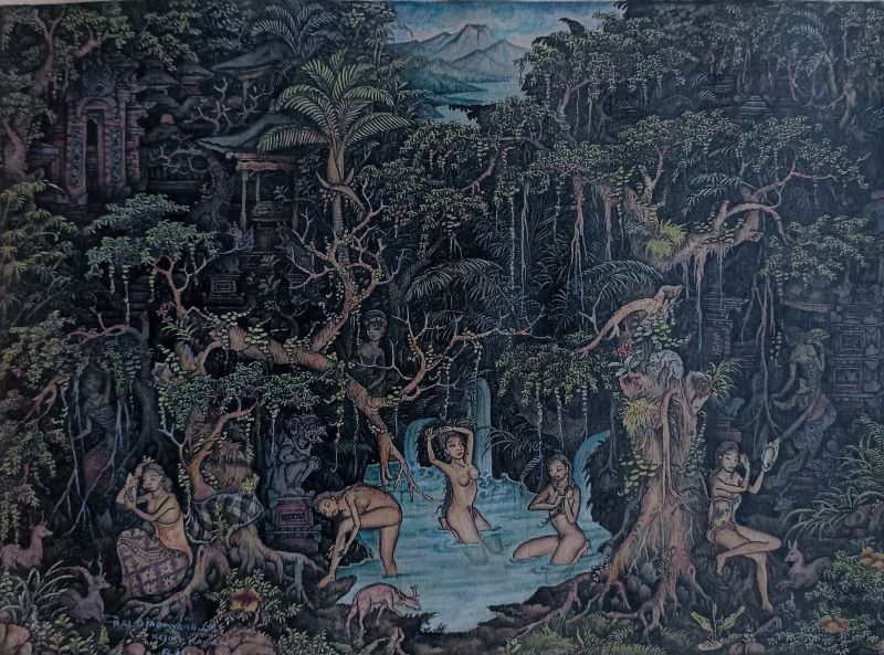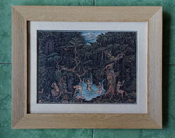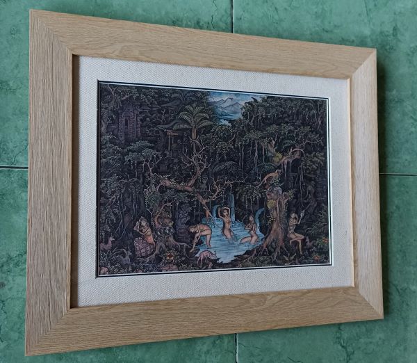 濁りのない美しい配色のグラデーションと、線の一つ一つが巧みな筆使いでくっきりと描写されています。村人たちの日々の生活や祭礼行事などが、美しいバリ島の農村風景を背景にコミカルなタッチで描かれた躍動的で楽しい作品です!
