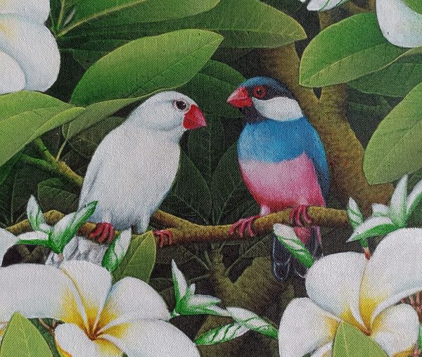 2対の白と桜の文鳥たちがキリリとした表情をしてて可愛いですね!葉の一枚一枚、花弁の一枚一枚が丁寧に描かれ、濃淡を強調して奥行きのある立体的な画面に仕上がっていて、まるで窓からプルメリア・ガーデンを覗いているような気分にさせてくれる作品です。